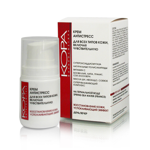 3. Крем-антистресс KORA. Этот продукт российского производителя подходит для всех типов кожи, даже для чувствительной. Успокаивает, снимает раздражение, шелушение, улучшает эластичность. Цена — от 450 рублей.